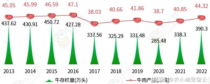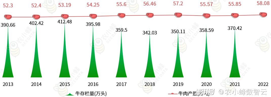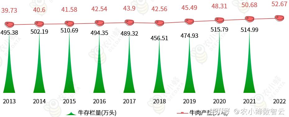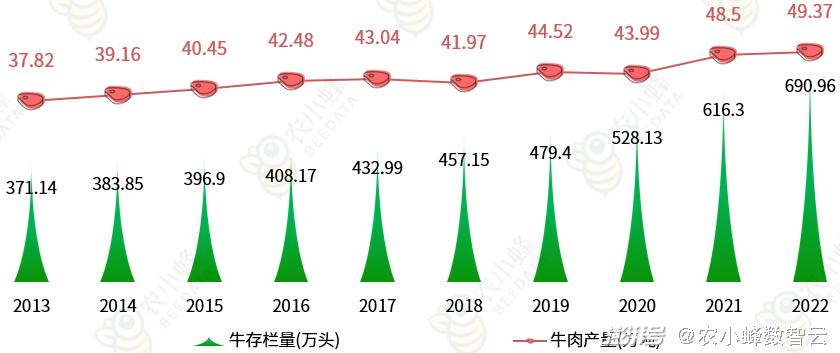 2022年,全國肉牛存欄約10215.85萬頭,出欄量達4839.91萬頭,屠宰肉牛約3010萬頭,牛肉產(chǎn)量718.26萬噸,產(chǎn)值約6780億元,近年來,肉牛相關(guān)生產(chǎn)數(shù)據(jù)均穩(wěn)定上升。