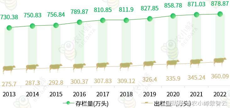 2022年,牛存欄量為390.3萬頭,在2022年全國牛存欄量(10215.85萬頭)中比重約3.82%;牛肉產(chǎn)量為44.32萬噸,位列全國第6位,在2022年全國牛肉產(chǎn)量(718.26萬噸)中比重約6.17%。