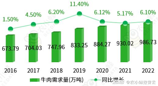 從牛肉需求量來看,2022年中國牛肉需求量達986.73萬噸,較2021年的930.02萬噸增加了56.71萬噸,同比增幅約6.1%。與2016年的673.79萬噸相比,中國牛肉需求量增加了312.94萬噸,增幅達46.44%,年均復合增長率約6.56%。與2022年牛肉產(chǎn)量(718.26萬噸)相比,中國牛肉需求缺口達268.47萬噸。
