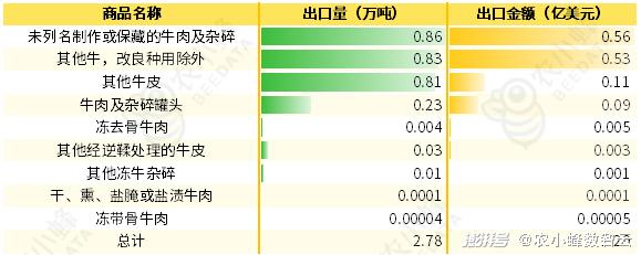 從具體出口商品來看,中國主要出口“未列名制作或保藏的牛肉及雜碎”、“其他牛,改良種用除外”、“其他牛皮”、“牛肉及雜碎罐頭”、“凍去骨牛肉”等肉牛相關(guān)商品(見下表),“未列名制作或保藏的牛肉及雜碎”的出口規(guī)模相對較大,2022年,中國出口“未列名制作或保藏的牛肉及雜碎”約0.86萬噸,出口金額為0.56億美元,在中國肉牛相關(guān)商品總出口量、出口金額中所占的比重分別為高達30.93%、43.41%。