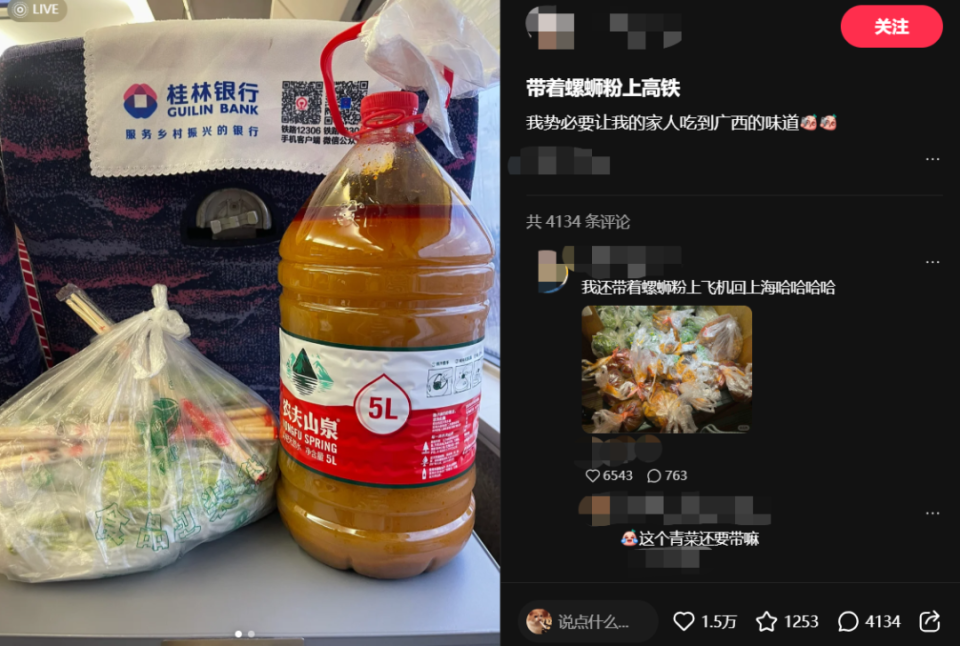 有網(wǎng)友提到,自己在今年“雙11”屯了80包螺螄粉,并且打算在保質(zhì)期內(nèi)全部吃光;還有不少螺螄粉愛(ài)好者為了吃到這份“原汁原味”的酸爽,專門跑去柳州各個(gè)螺螄粉門店打卡,甚至打包一大桶螺螄粉原料上高鐵。