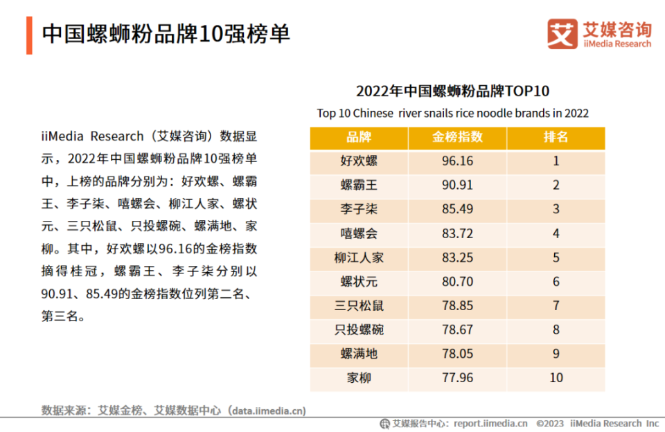 螺螄粉衍生出的預(yù)包裝產(chǎn)品和標(biāo)準(zhǔn)化生產(chǎn),是從地域走向全國(guó)的重要因素。艾媒咨詢報(bào)告顯示,2022年中國(guó)螺螄粉品牌5強(qiáng)分別為好歡螺、螺霸王、李子柒、嘻螺會(huì)和柳江人家。除了李子柒之外,其余四個(gè)都是在2015年前后成立的柳州品牌,逐漸從小型工廠發(fā)展為全產(chǎn)業(yè)鏈的生產(chǎn)商。從淘寶價(jià)格來(lái)看,目前幾個(gè)品牌價(jià)格差別不大,單包售賣都在12-15元左右。