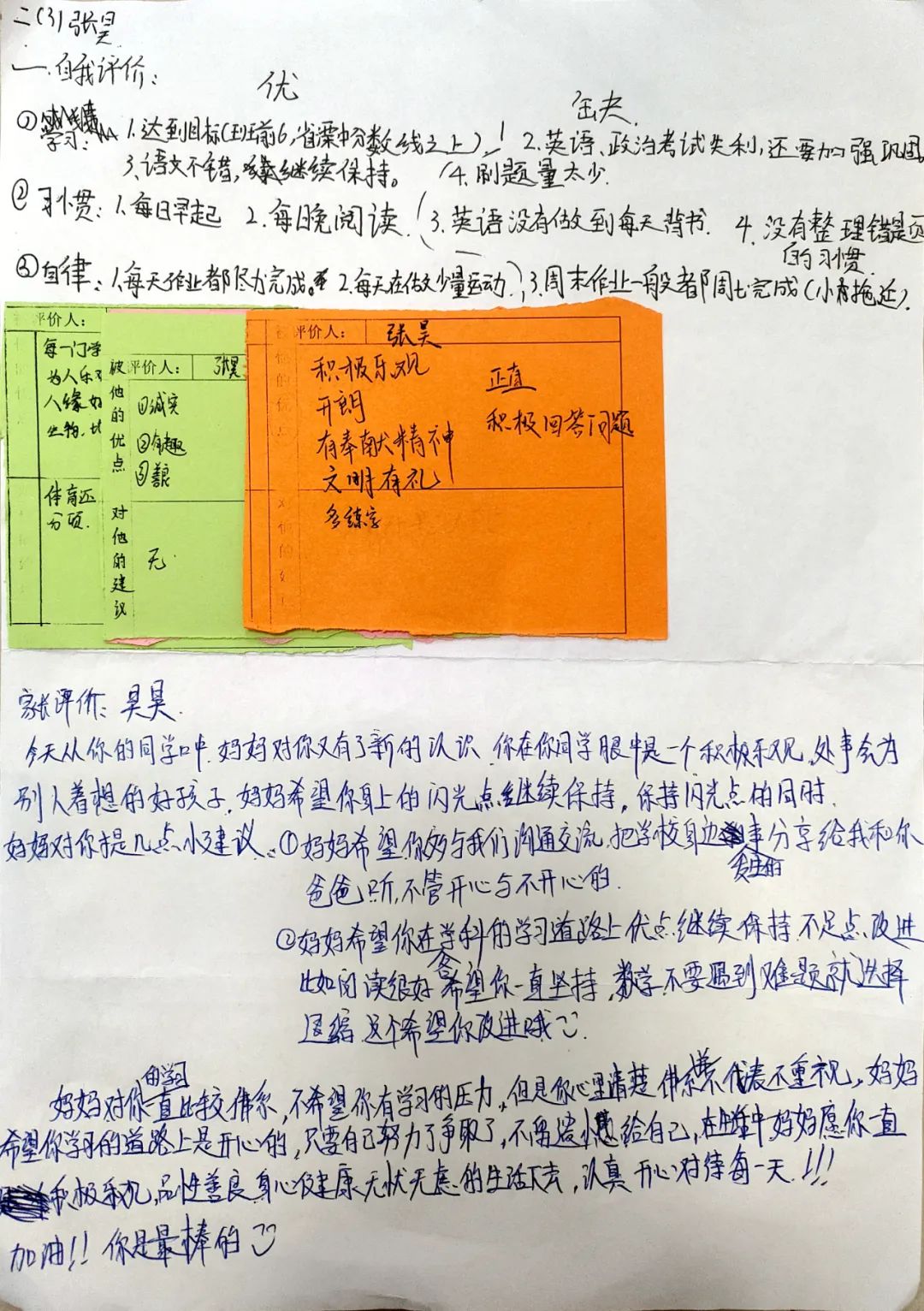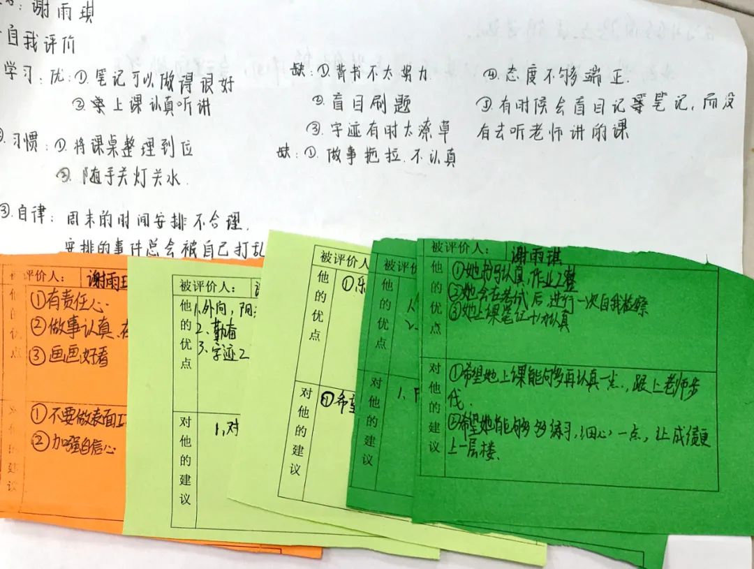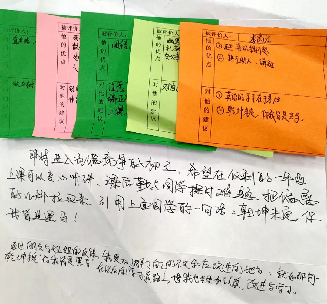 在點(diǎn)評(píng)學(xué)生環(huán)節(jié),班主任薛春春改變了以往老師評(píng)價(jià)學(xué)生的單一視角,而是創(chuàng)新性地采用了讓學(xué)生自評(píng)與互評(píng)結(jié)合的方式,在學(xué)生評(píng)價(jià)展示卡上寫下來。他們低頭沉思,認(rèn)真書寫自己的優(yōu)點(diǎn)與不足,分享著自己的成長故事。