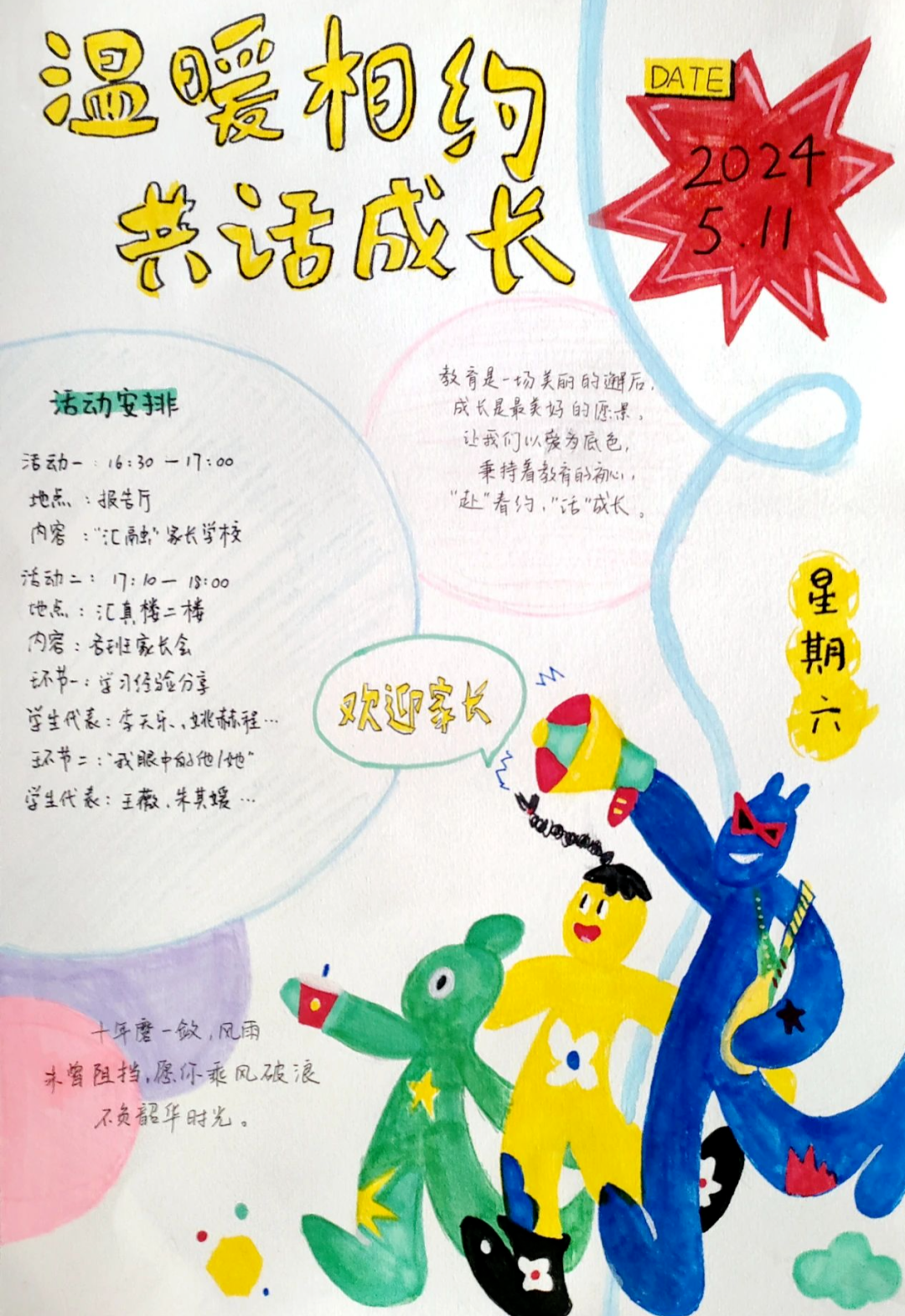 今年5月份的一天,金陵中學(xué)溧水分校的一個(gè)初三班級(jí)家長群里,悄然出現(xiàn)了一張由學(xué)生親手繪制的家長會(huì)海報(bào),瞬間吸引了所有家長的眼球。這張海報(bào)不僅清晰標(biāo)注了家長會(huì)的時(shí)間、地點(diǎn),還巧妙地將發(fā)言學(xué)生的名單融入其中,預(yù)告了他們即將分享的精彩內(nèi)容。家長們紛紛點(diǎn)贊、留言,對(duì)這次家長會(huì)充滿期待。