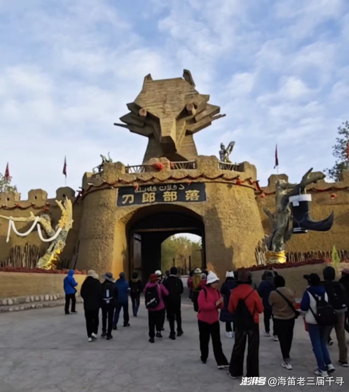走進刀郎村莊,褐色的城墻高聳,門樓上一個巨形的木制狼頭,兩根圓木即是狼的雙眼。狼是古代刀郎人的原始圖騰,狼為野性,是群居動物,代表勇氣、堅韌、獨立,還有團隊合作、忠誠和族群意識。刀郎人有勇敢面對困難和面對逆境的能力,高度的團隊合作和族群意識,他們推崇狼的精神。