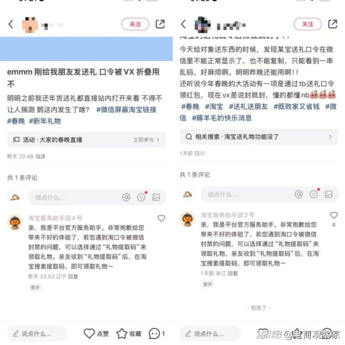這幾天,陸續(xù)有網(wǎng)友在小紅書(shū)發(fā)帖表示,突然發(fā)現(xiàn)淘寶送禮口令,在微信卻復(fù)制不了,在春晚進(jìn)行全民互動(dòng)期間,使用體驗(yàn)也是阻礙重重。