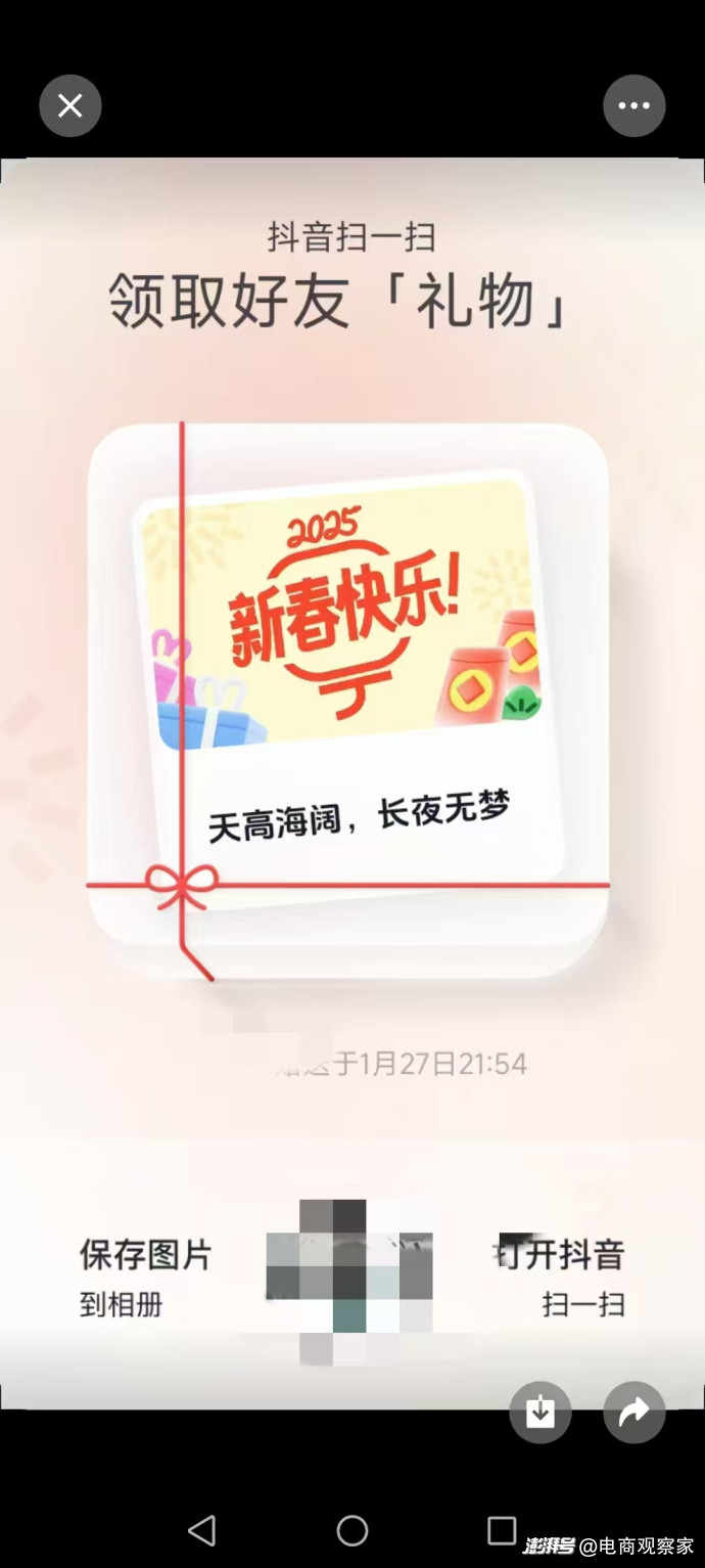 隨后抖音會(huì)生成一張圖片,下單人將圖片轉(zhuǎn)發(fā)給微信好友,好友需要將照片保存下來(lái),并打開(kāi)抖音掃一掃即可“打開(kāi)禮物”。