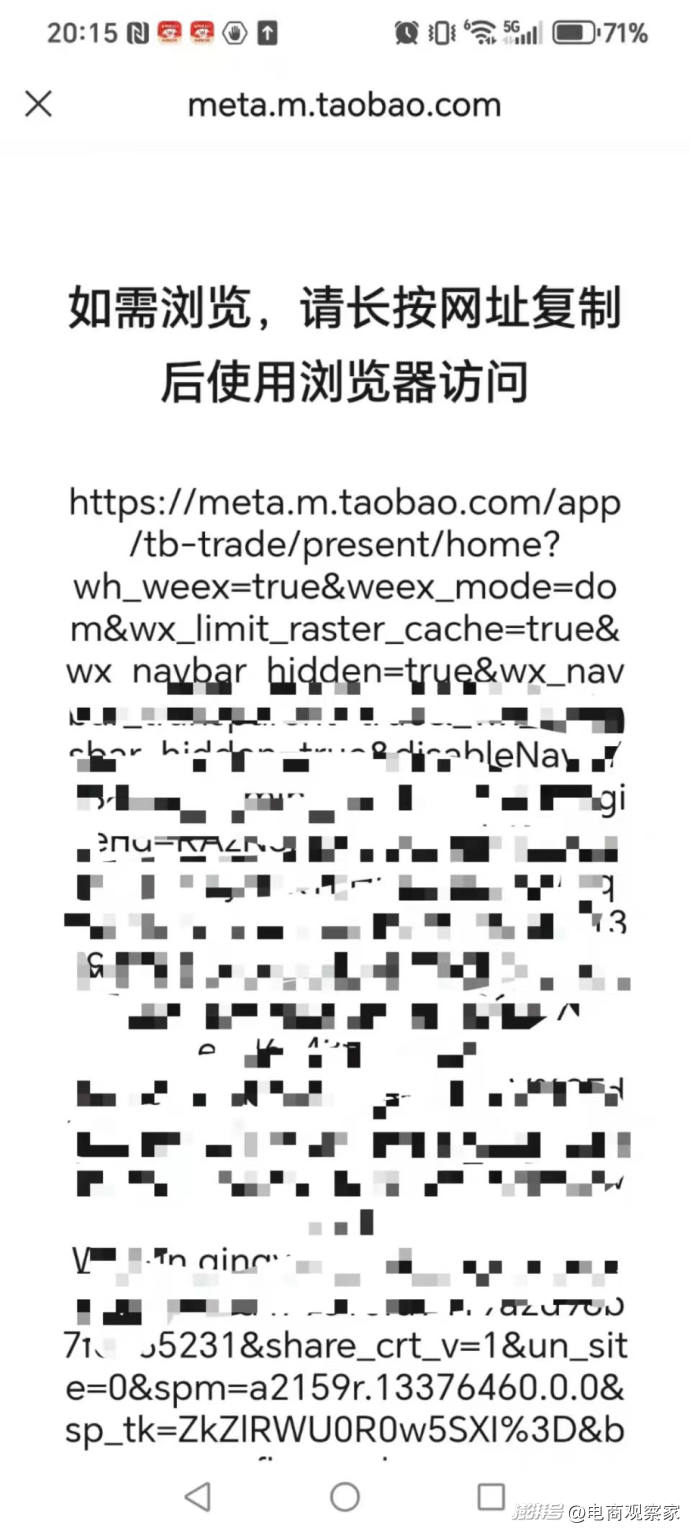 當(dāng)然,不復(fù)制也可以;但就只能按照第2種方式,即點(diǎn)鏈接。然而,點(diǎn)開(kāi)以后卻是一條巨長(zhǎng)的網(wǎng)址鏈接,需要將該網(wǎng)址復(fù)制,然后打開(kāi)瀏覽器粘貼方可轉(zhuǎn)到淘寶App。如此長(zhǎng)的長(zhǎng)度,恐怕會(huì)給很多不熟練使用手機(jī)的人帶來(lái)麻煩,看不懂的中老年人甚至可能還以為是亂碼。