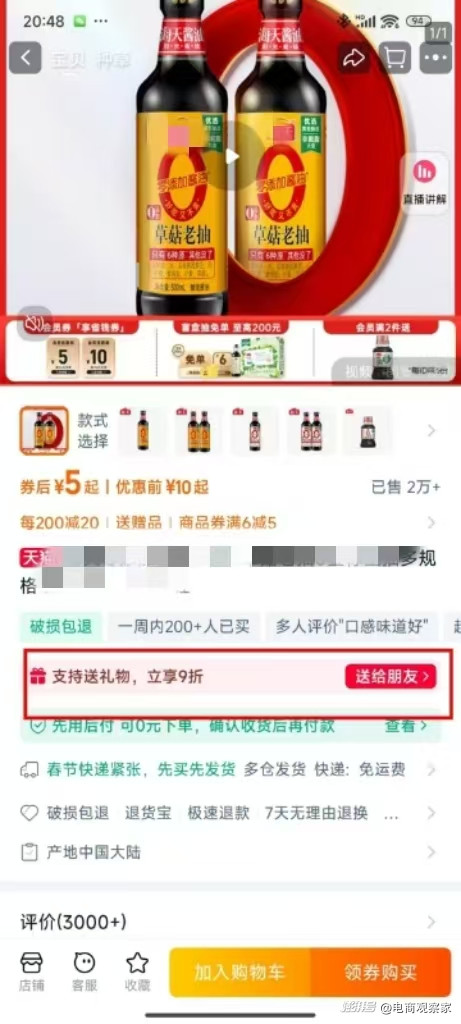 淘寶“送禮”功能的位置不難找到,在商品標(biāo)題的正下方,就有“支持送禮物”的字樣,有此字樣的商品,才可以參與“送禮”功能。整個(gè)送禮功能分為3步:用戶買下商品、分享給朋友口令、朋友填上地址。