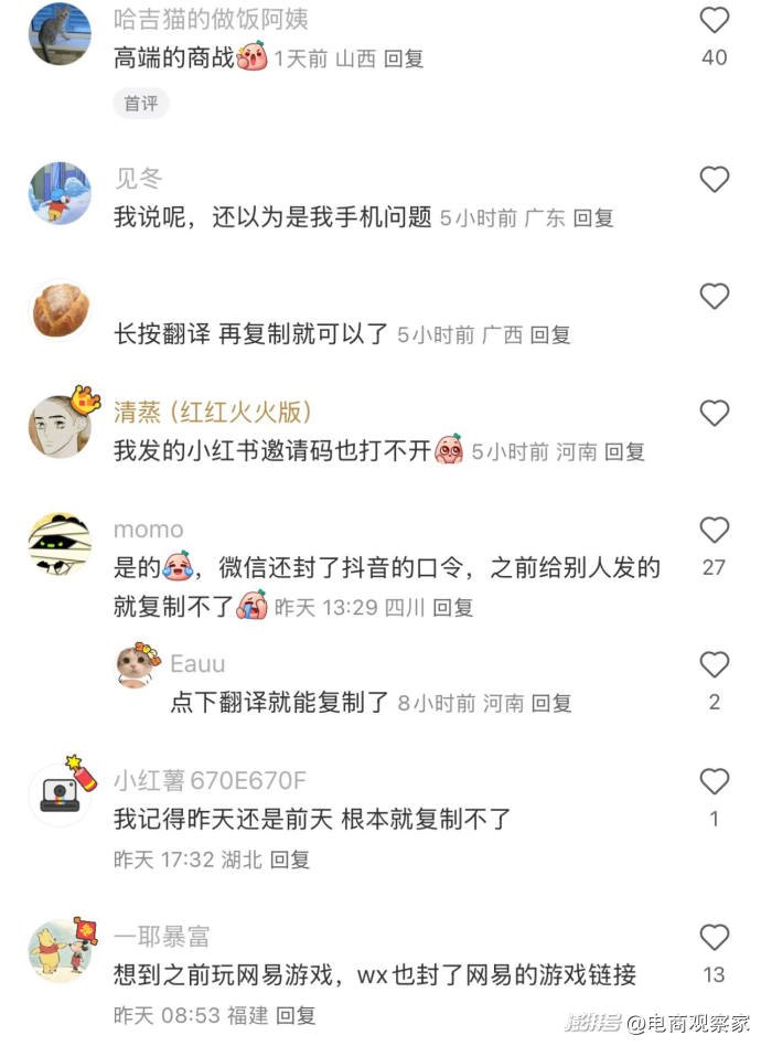 對(duì)于這種技術(shù)上設(shè)墻、設(shè)障造成的使用步驟繁瑣,淘寶依靠自己打磨產(chǎn)品“向內(nèi)求”是很難突破的。網(wǎng)友也表示,高端的商戰(zhàn),往往用最樸素的方式,小紅書(shū)邀請(qǐng)碼、抖音口令、網(wǎng)易游戲鏈接,都曾經(jīng)被封禁過(guò)。