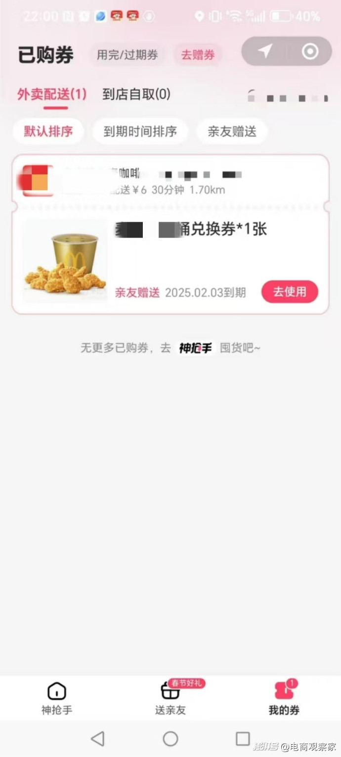 被贈(zèng)送方領(lǐng)取商品券后,可以通過(guò)“外賣-我的券-神搶手券”,找到具體的券,點(diǎn)擊“去使用”后填寫(xiě)地址,即可完成下單。