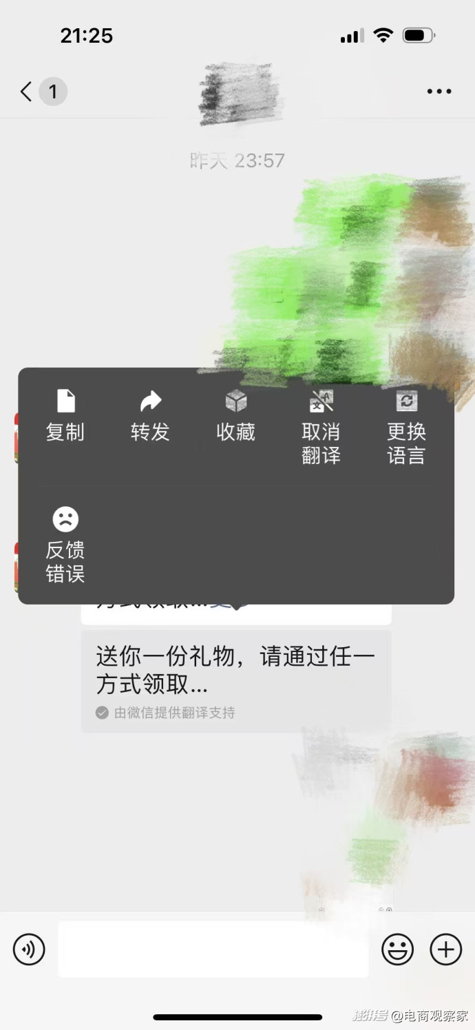 其次,盡管口令中第3條表示,“完整復(fù)制這條信息,打開(kāi)淘寶App自動(dòng)識(shí)別”,但這條口令并不能直接被復(fù)制,需要先將消息“翻譯”,才可以對(duì)翻譯內(nèi)容進(jìn)行“復(fù)制”。連“引用”該截圖也不行。