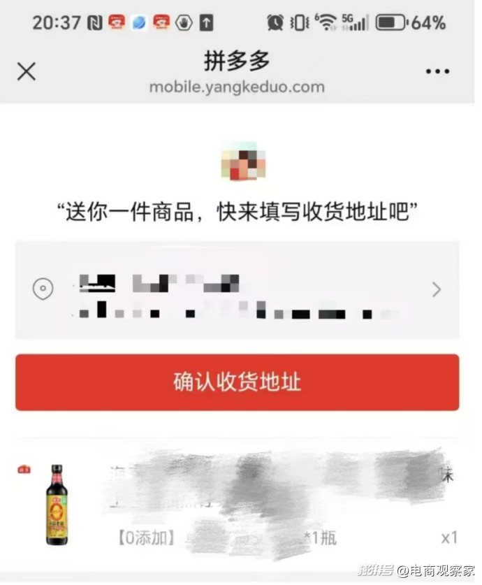 和淘寶和京東不同的是,在商品界面看不到“送禮”字樣,但用戶可以進(jìn)入下單界面,點(diǎn)開(kāi)地址界面,下方會(huì)出現(xiàn)“支付后邀請(qǐng)好友填寫(xiě)地址”的選項(xiàng),選擇該選項(xiàng),在照常下單后,選擇“邀請(qǐng)微信好友填寫(xiě)”,隨后該訂單鏈接會(huì)被直接轉(zhuǎn)發(fā)到微信好友,好友只需要點(diǎn)開(kāi),并填寫(xiě)確認(rèn)收貨地址,即可完成收取禮物。