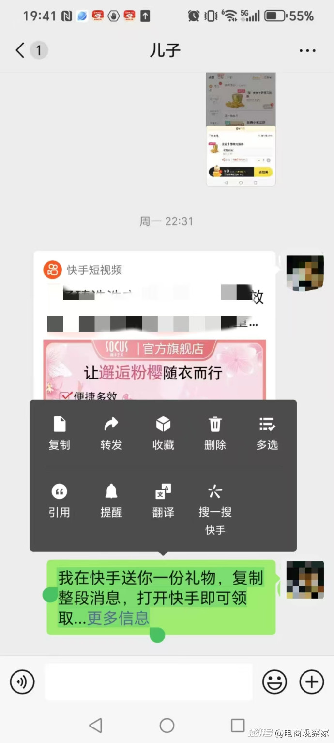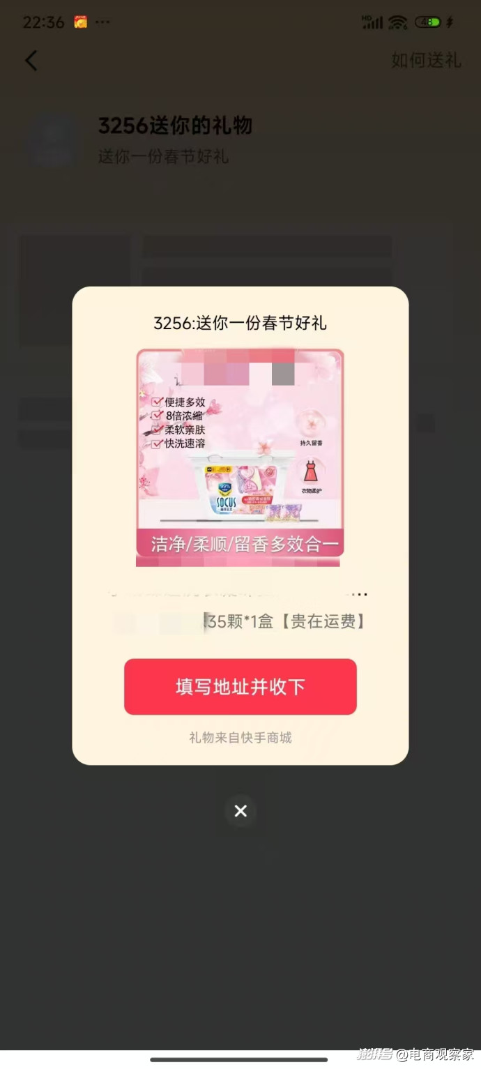 盡管口令這一點(diǎn)與淘寶很相似,但不同的是,快手的該口令可以在微信復(fù)制,收禮人在復(fù)制該口令后,打開(kāi)快手App,會(huì)彈窗出禮物信息,點(diǎn)擊“立即查看”,即可看到禮物信息,并選擇填寫(xiě)地址并收下。