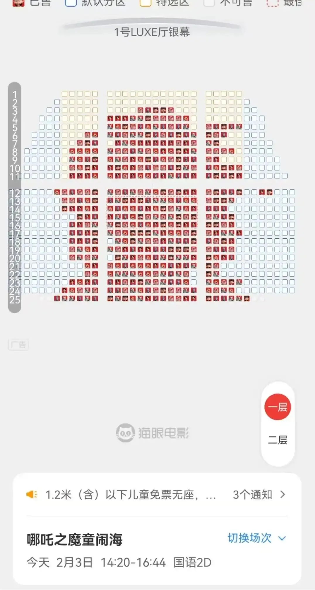 2月3日,可容納1300多人的上海大光明電影院1號(hào)廳將放映3場(chǎng)《哪吒2》;5日,將放映5場(chǎng)?!斑@個(gè)廳是有兩層的,都能看清銀幕,推薦坐在中間位置。”該影院的工作人員說,“并不是因?yàn)椤赌倪?》太火了才在這個(gè)廳放,以前這個(gè)廳幾乎每天都有電影放映?!?/p>
