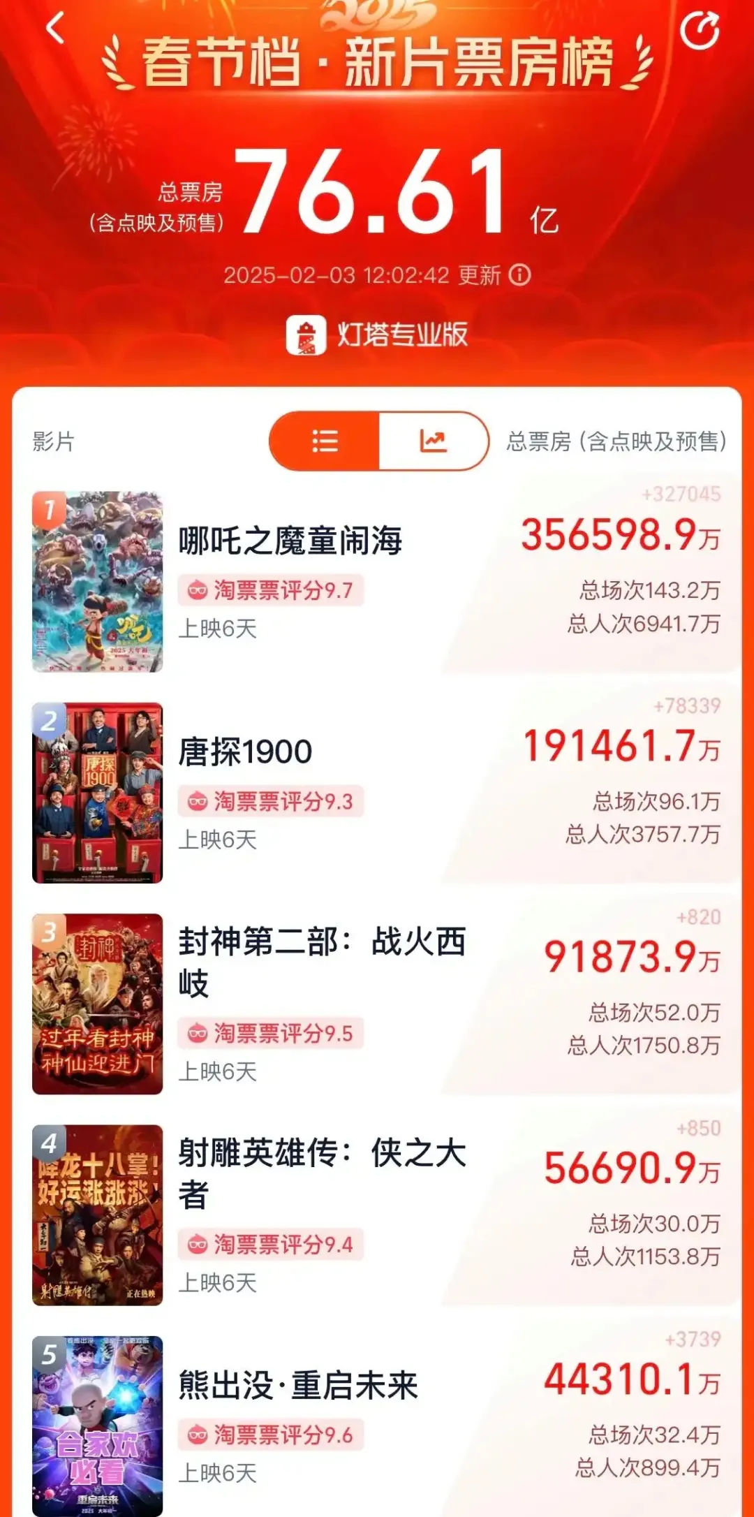 燈塔專業(yè)版數(shù)據(jù)顯示,截至2月3日12時(shí)許,國(guó)產(chǎn)動(dòng)畫電影《哪吒之魔童鬧?!罚ㄒ韵潞?jiǎn)稱《哪吒2》)春節(jié)檔總票房破35.62億元,超《唐探1900》(檔期內(nèi)票房35.61億元)春節(jié)檔票房成績(jī),成為中國(guó)影史春節(jié)檔期內(nèi)票房冠軍。