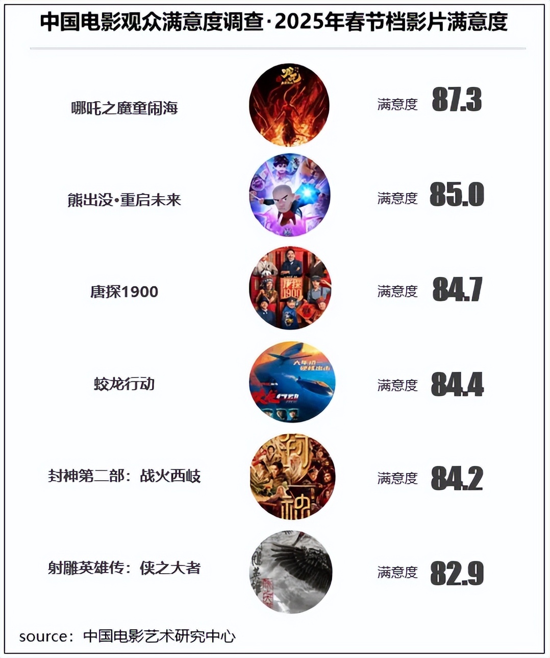 中國(guó)電影觀眾滿意度調(diào)查?2025年春節(jié)檔調(diào)查結(jié)果顯示,春節(jié)檔主調(diào)查的6部影片均突破82分,其中《哪吒2》滿意度為87.3分,超越去年檔期第一的《飛馳人生2》(86.2分),為近兩年春節(jié)檔觀眾最“滿意”影片;《熊出沒?重啟未來》為85分,居第二位;《唐探1900》《蛟龍行動(dòng)》《封神第二部:戰(zhàn)火西岐》3部影片均超84分;《射雕英雄傳:俠之大者》超82分,排在第六位。