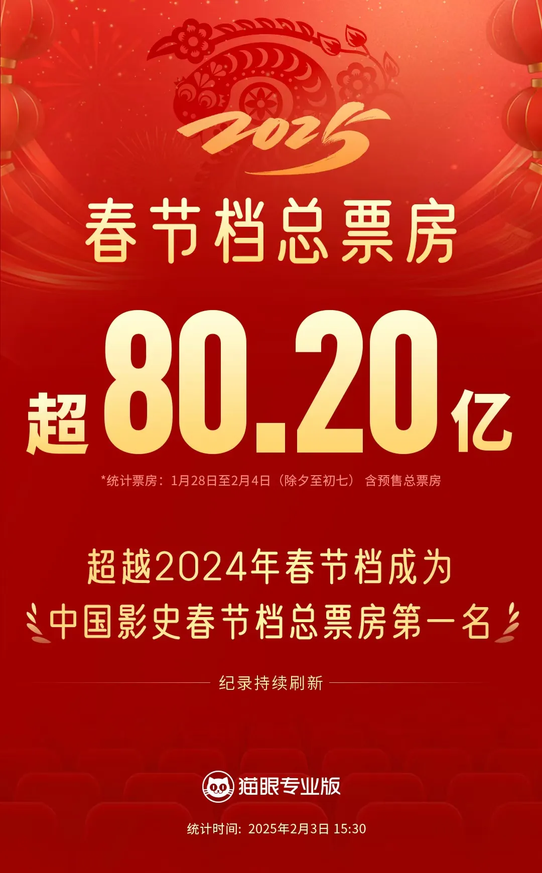 與此同時(shí),2025年春節(jié)檔票房刷新影史紀(jì)錄。據(jù)貓眼專業(yè)版數(shù)據(jù),截至2月3日15時(shí)30分,2025年春節(jié)檔總票房超80.20億元,超過2024年春節(jié)檔票房成績(jī),成為中國(guó)影史春節(jié)檔票房冠軍,且紀(jì)錄還在持續(xù)刷新中。