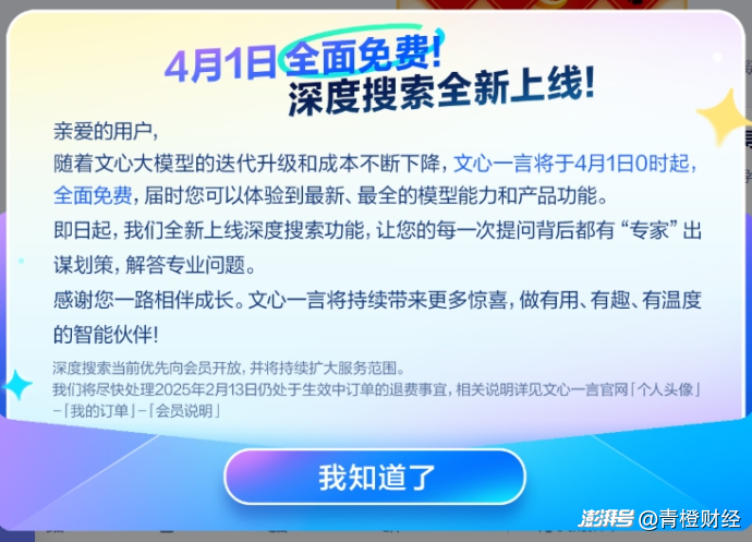 免費向普通用戶開放使用、且更好用的DeepSeek,無疑給百度的收費模式帶來巨大的沖擊。2月13日,百度終于坐不住了,宣布旗下大模型產(chǎn)品文心一言自4月1日0時起將全面免費開放,其新上線的深度搜索功能將于4月1日免費開放使用。亡羊補牢,猶未晚也。