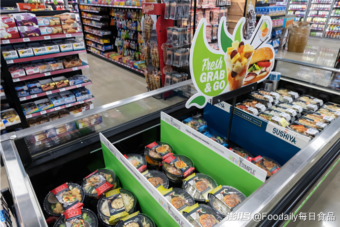 H-E-B Fresh Bites 門店設(shè)有多個(gè)冷藏柜,里面存放著新鮮農(nóng)產(chǎn)品、沙拉、三明治、每日制作的壽司、肉類和奶酪小吃、新鮮果汁、康普茶等商品。