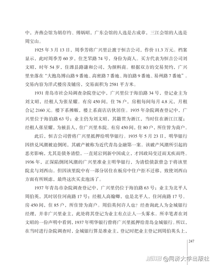這本青島史研究新作一改往昔里院研究的狀態(tài),開始將與里院有關(guān)“人”的元素納入研究視野中,諸如里院的業(yè)主、經(jīng)租人、租戶、市政官員、建筑師以及院丁、雜役、清道夫等,他們在作者栩栩如生的描述中,從塵封已久的檔案中走了出來。透過這本書,我們可以一窺“隱身”于里院中、曾湮沒于歷史風(fēng)云中的一個個富有戲劇色彩的小人物,他們的出場,讓曾鮮活于這座城市的百態(tài)人間觸手可及。