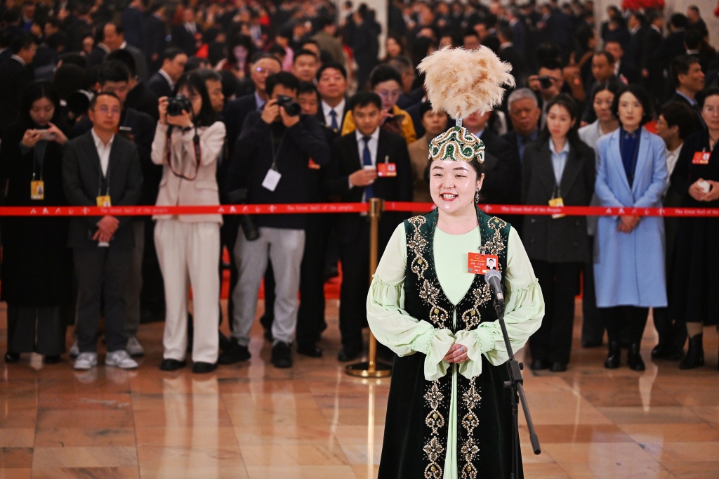 2025年3月11日,北京,人民大會堂中央大廳北側(cè)舉行十四屆全國人大三次會議第三場“代表通道”集中采訪活動。全國人大代表、新疆阿勒泰地區(qū)文博院館員卓婭·巴合提。視覺中國 圖