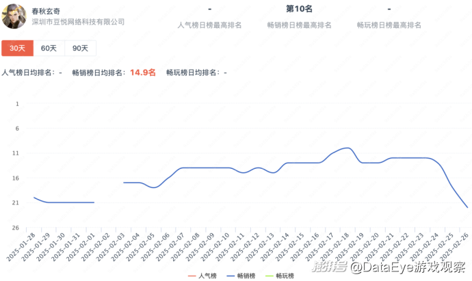 中手游發(fā)行的《春秋玄奇》同樣表現(xiàn)出色,DataEye-ADX微信小游戲榜單顯示,《春秋玄奇》近30天時(shí)間里持續(xù)處于微信小游戲暢銷榜TOP20以內(nèi)。
