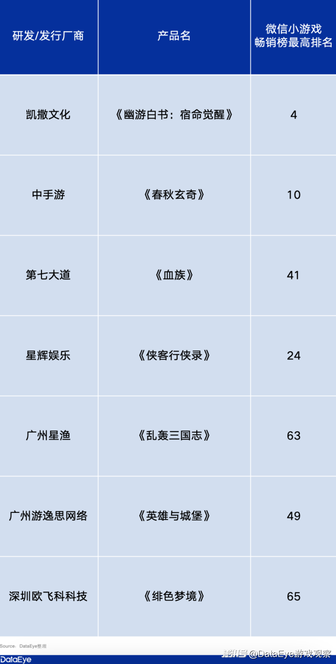 DataEye研究院發(fā)現(xiàn)今年以來(lái),有多款卡牌小游戲產(chǎn)品進(jìn)入微信小游戲暢銷榜前列,其中包括中手游、星輝、凱撒文化等廠商的產(chǎn)品。