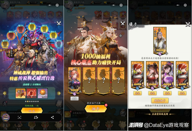 再如《春秋玄奇》,除了常見(jiàn)的新手禮包外,還設(shè)計(jì)了“千抽征豪”、“直升豪禮”模式,前者可以讓玩家在免費(fèi)的1000抽里面選擇想要的1張單卡;后者則可以將玩家想深度養(yǎng)成的武將達(dá)成較高的品級(jí)。