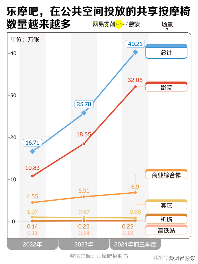 具體來看,影院是樂摩吧投放按摩椅最多、增長速度最快的地方,2022 年到 2024 年前三季度,累計投放數(shù)量從 10.83 萬張暴增到 32.05 萬張 [1]。