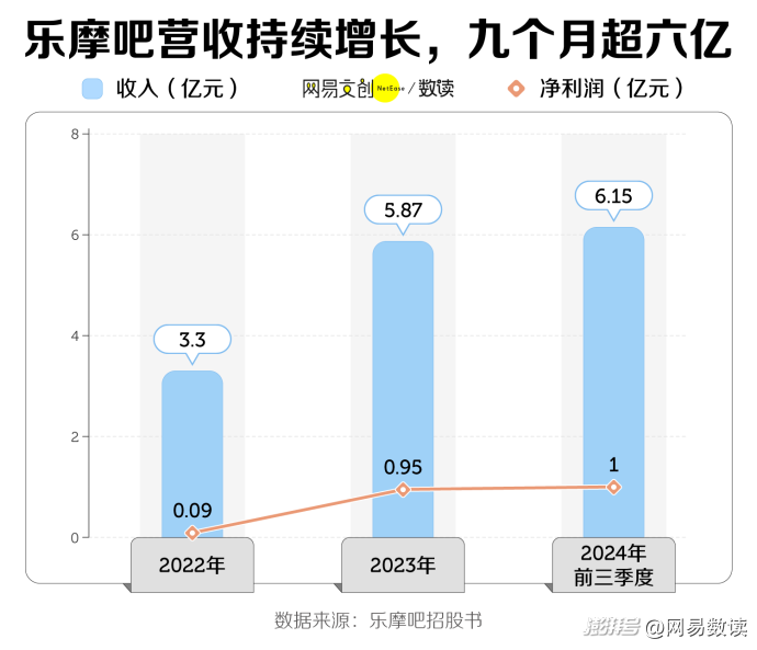 2023 年,樂摩吧的凈利潤較上一年增長了十余倍。進入 2024 年,樂摩吧繼續(xù)保持增長勢頭,前三季度的凈利潤達 1 億,營收超 6 億,均已超過 2023 年全年 [1]。