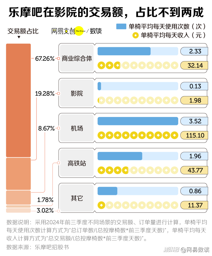 我們計算按摩椅的使用率發(fā)現(xiàn),2024 年前三季度,影院每張按摩椅大概每十天才使用一次,而商場平均每天就會使用 2-3 次,使用率幾乎是影院的 18 倍 [1]。因此,哪怕影院的按摩椅數(shù)量比商場多了近五倍,收入還是差了一大截。