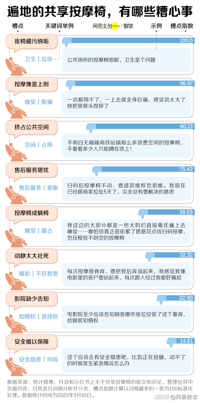統(tǒng)計了微博、抖音和小紅書中關(guān)于共享按摩椅的負面內(nèi)容后,我們發(fā)現(xiàn),排在第一的槽點是共享按摩椅的衛(wèi)生問題。不少人覺得在人流量大的地方,共享按摩椅的清潔跟不上,衛(wèi)生狀況堪憂。