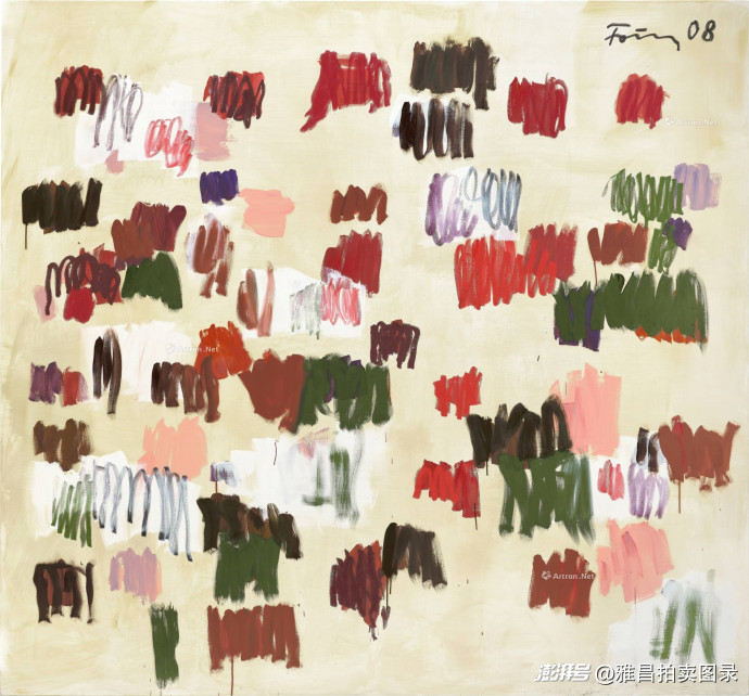 首登拍場(chǎng)的已故德國(guó)藝術(shù)家君特?弗格作品《無題》以889萬港元成交。此作曾參展柏林 Max Hetzler 畫廊 2011 年為藝術(shù)家舉辦的重要回顧展 〈Günther F?rg: 1987 – 2011 〉。《無題》畫風(fēng)不拘一格,充滿動(dòng)感的陰影條紋在廣闊的畫布上翩翩起舞,既井然有序,又狂放松散;時(shí)而開放,時(shí)而約束;看似簡(jiǎn)單直接,卻又壯美無窮,令人迷醉。
