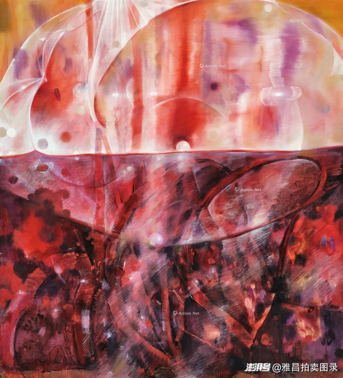 當(dāng)代新秀李黑地在去年獲佩斯畫廊代理后首登拍場(chǎng),且獲得佳績(jī),聲名鵲起。當(dāng)晚拍賣以李黑地《在死的冰上起愛的火災(zāi)》開場(chǎng),便吸引多位藏家的踴躍競(jìng)投,最終經(jīng)過18口競(jìng)價(jià)之后,以110萬港元落槌,含傭金以139.7萬港元成交,為低估價(jià)的4.6倍,刷新藝術(shù)家最高拍賣紀(jì)錄?!对谒赖谋掀饜鄣幕馂?zāi)》曾在藝術(shù)家2022年全球首個(gè)個(gè)展“雀在破曉”中首度亮相,畫中縱情恣意的筆觸像層層輕煙縈繞,包裹著暖流暗涌的冰面,彷彿沈寂的寒冰正如題燃起,漸漸融化。而醞釀已久的一顆顆珍珠猶如氣息的泡沫般隱若浮現(xiàn),畫面如夢(mèng)似幻,情欲的暗喻在李氏筆下綺麗至極。