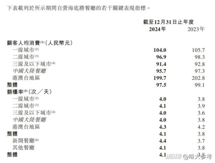 比如主品牌呷哺呷哺的翻臺(tái)率在2024年為2.5次/天,而2023年的同期翻臺(tái)率為2.6次/天。湊湊餐廳的經(jīng)營(yíng)指標(biāo)也在下降,翻臺(tái)率由上一年同期的2.0次/天降至2024年的1.6次/天。