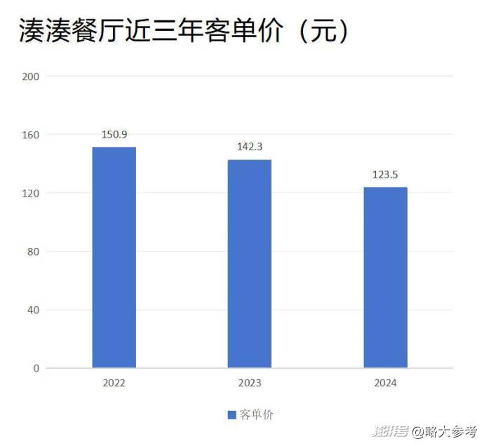 其定位高端的湊湊餐廳也跟隨降價(jià)策略,推出小份菜,將客單價(jià)從2022年的150元拉低至2023、2024年的142.3元、123.5元,一連降了三年,幅度一年比一年大。