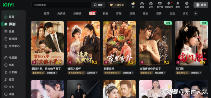 在愛奇藝PC端,微劇近期悄然升至了頻道的第一位;而在愛奇藝移動端,微劇近期被放在了電視劇tab之后,電影之前。