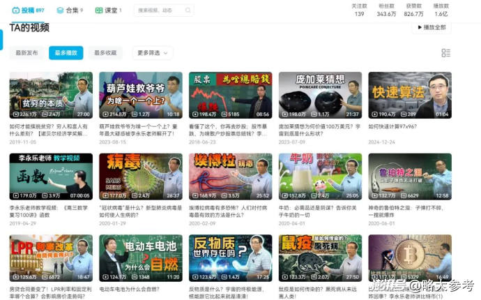 截至2025年,李永樂(lè)創(chuàng)作的科普視頻累計(jì)超450個(gè),全網(wǎng)播放量超10億,其作品被網(wǎng)友稱為“永樂(lè)大典”——與明朝《永樂(lè)大典》形成文化意象的跨時(shí)空呼應(yīng),而他也由原來(lái)單純的物理老師變?yōu)榉何幕I(lǐng)域現(xiàn)象級(jí)的網(wǎng)紅代表。
