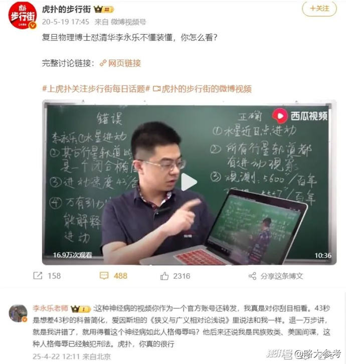 最近,他在微博上跟人“打架”。對(duì)方是一個(gè)自稱是復(fù)旦物理學(xué)博士的博主,曾經(jīng)批評(píng)過(guò)李永樂(lè)的一條科普視頻,其中不乏“不懂裝懂,腦子不好使了,跟他學(xué)你就完了,這種人(指李永樂(lè))可能有點(diǎn)問(wèn)題”等侮辱性詞匯。此前,這名博主還用“民族敗類、美國(guó)間諜”這樣的詞語(yǔ)形容過(guò)李永樂(lè)。