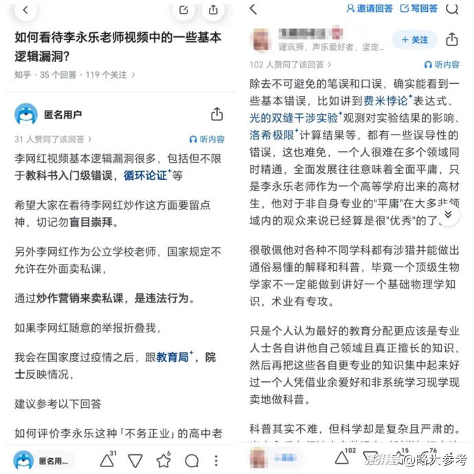 “李網(wǎng)紅視頻基本邏輯漏洞很多,包括但不限于教科書入門級(jí)錯(cuò)誤、循環(huán)論證等”、“比如講到費(fèi)米悖論表達(dá)式,光的雙縫干涉實(shí)驗(yàn)觀測(cè)對(duì)實(shí)驗(yàn)結(jié)果的影響,洛希極限計(jì)算結(jié)果等,都有一些誤導(dǎo)性的錯(cuò)誤”、“李永樂(lè)的物理水平,真的是本科畢業(yè)很懸的水平”……