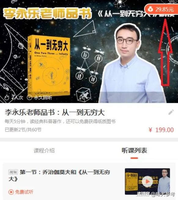 李永樂(lè)也曾嘗試做過(guò)一個(gè)《從一到無(wú)窮大》解讀的課程,售價(jià)199元。盡管他沒(méi)有對(duì)外公布課程的銷售數(shù)據(jù),但視頻下的評(píng)論數(shù)量和彈幕是窺探銷量的一個(gè)窗口——幾乎都是個(gè)位數(shù),且大多集中在2020年前后。