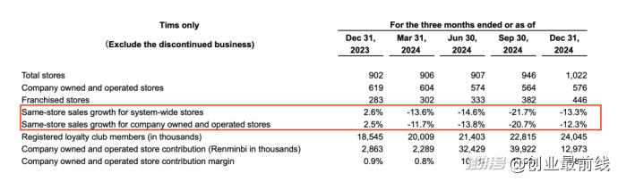 過去一年,Tims天好中國在同店銷售額增長(編者注:“同店銷售額增長”是零售/餐飲企業(yè)分析的核心指標,即在特定期間內(nèi)已運營12個月或更長時間的門店,其銷售額與上一年同期相比的百分比變化)等關(guān)鍵數(shù)據(jù)方面也出現(xiàn)了下滑。