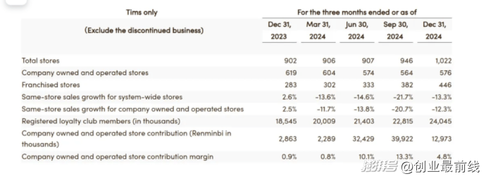 截至2024年12月31日,Tims天好中國一共有1022家門店,其中,公司擁有和經(jīng)營的商店為576家,加盟店為446家。一年的時間內(nèi),Tims天好中國加盟店增加了163家。