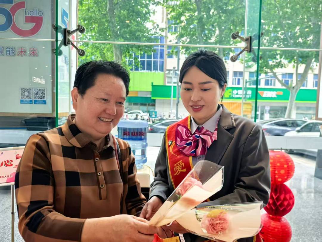 在揚(yáng)中江洲西路營業(yè)廳“愛心翼站”,媽媽們精心修剪枝葉、構(gòu)思布局,將康乃馨的柔美、向日葵的朝氣、玫瑰的浪費(fèi)融入作品中,每一束鮮花都承載著對(duì)母親的深情告白,愛心大使將鮮花送給前來辦業(yè)務(wù)的客戶媽媽。一籃籃生機(jī)盎然的花藝作品,一句句飽含深情的真情告白,活動(dòng)現(xiàn)場(chǎng)化作愛的海洋。