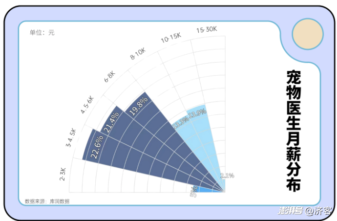 但是專(zhuān)業(yè)寵物醫(yī)生的稀缺并沒(méi)有為醫(yī)生們帶來(lái)高待遇的薪資水 平。有近四成的寵物醫(yī)生薪資在6000元以下,其中26%薪資情況在 3000-4500元之間,行業(yè)內(nèi)月薪破萬(wàn)的從業(yè)者不到三成,這一現(xiàn)實(shí)也 直接導(dǎo)致了這個(gè)從業(yè)者巨大的流動(dòng)性。