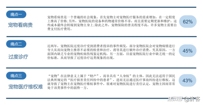 總的來(lái)說(shuō),寵物醫(yī)療存在三大痛點(diǎn):一是看病貴,62%的調(diào)研用戶(hù)認(rèn)為費(fèi)用過(guò)高;二是過(guò)度診療,45%的用戶(hù)覺(jué)得這一問(wèn)題突出,導(dǎo)致額外支出不必要的醫(yī)療費(fèi)用;三是維權(quán)難,43%的用戶(hù)在遇到問(wèn)題時(shí)難以有效維權(quán)。這些痛點(diǎn),正是寵物主們對(duì)寵物醫(yī)療現(xiàn)狀的真實(shí)寫(xiě)照。