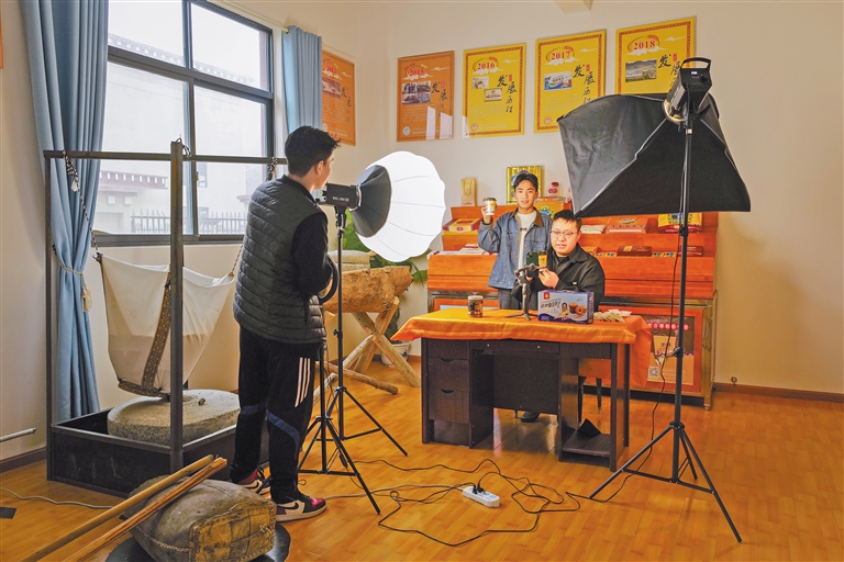 圖為洛隆縣洛宗特色產(chǎn)品開(kāi)發(fā)公司的工作人員正在直播銷售青稞掛面及青稞餅干。記者 丹增群培 攝