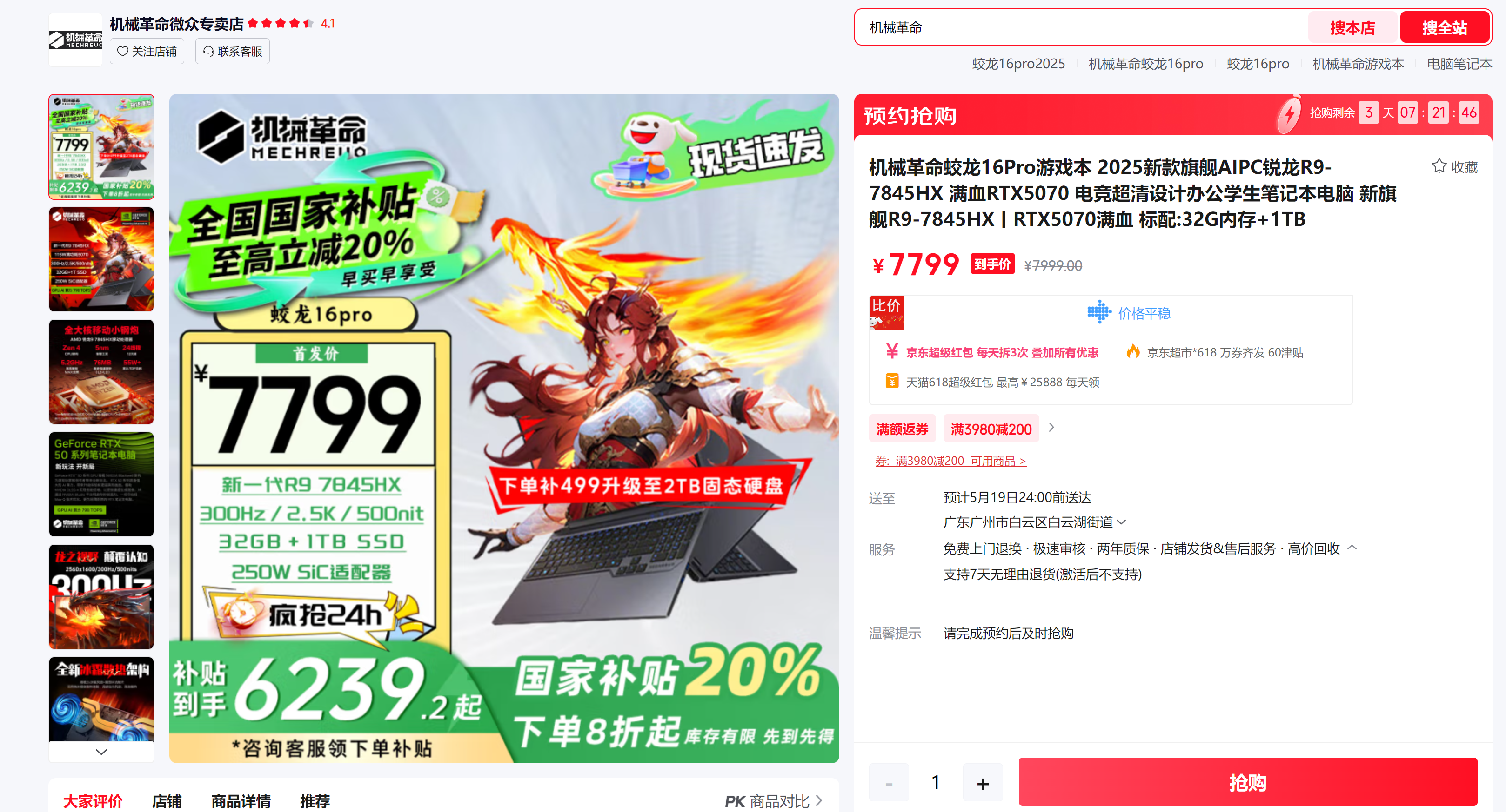 素以性價比為競爭力的機械革命,搭載銳龍R9-7845HX和滿血RTX 5070的蛟龍16 Pro游戲本國補后售價更是來到了6239元起。70%以上銷量依賴游戲本的華碩和機械革命,依靠產(chǎn)品硬實力和國補政策,今年第一季度分別取得了中國大陸線上筆記本電腦銷量的第二名和第四名,其中機械革命銷量同比增長高達120%。