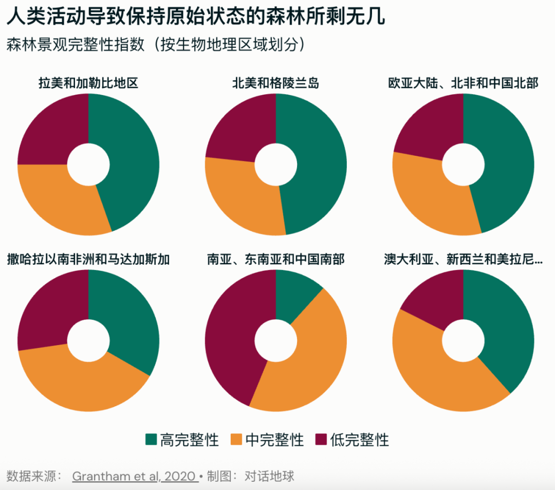 這一數(shù)據(jù)來自WCS2020年發(fā)表在《自然-通訊》(Nature Communications)上的一項研究。該研究還顯示,地球現(xiàn)存的43億公頃森林中,基本保持原始狀態(tài)的僅有40%(即17億公頃),其中受官方保護的還不足30%。